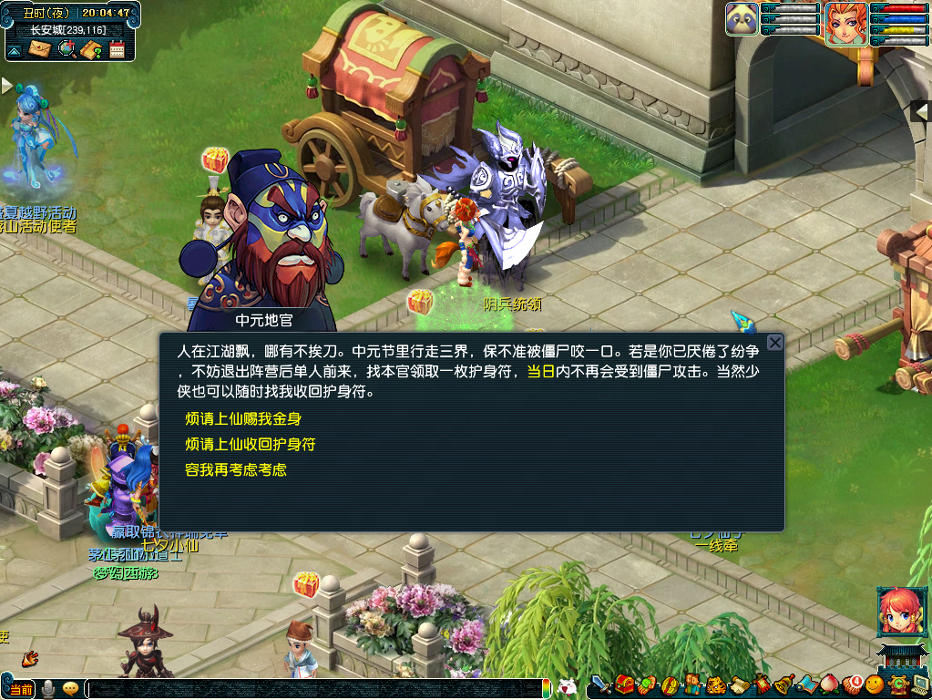 如果你对僵尸和道士之间的恩怨情仇感到厌倦,只想做个安静的美男子/女子,可以去找长安城的中元地官(237,113)领取护身符,当天就免疫僵尸的攻击啦!想取消护身符?没问题,随时找地官大人就行!