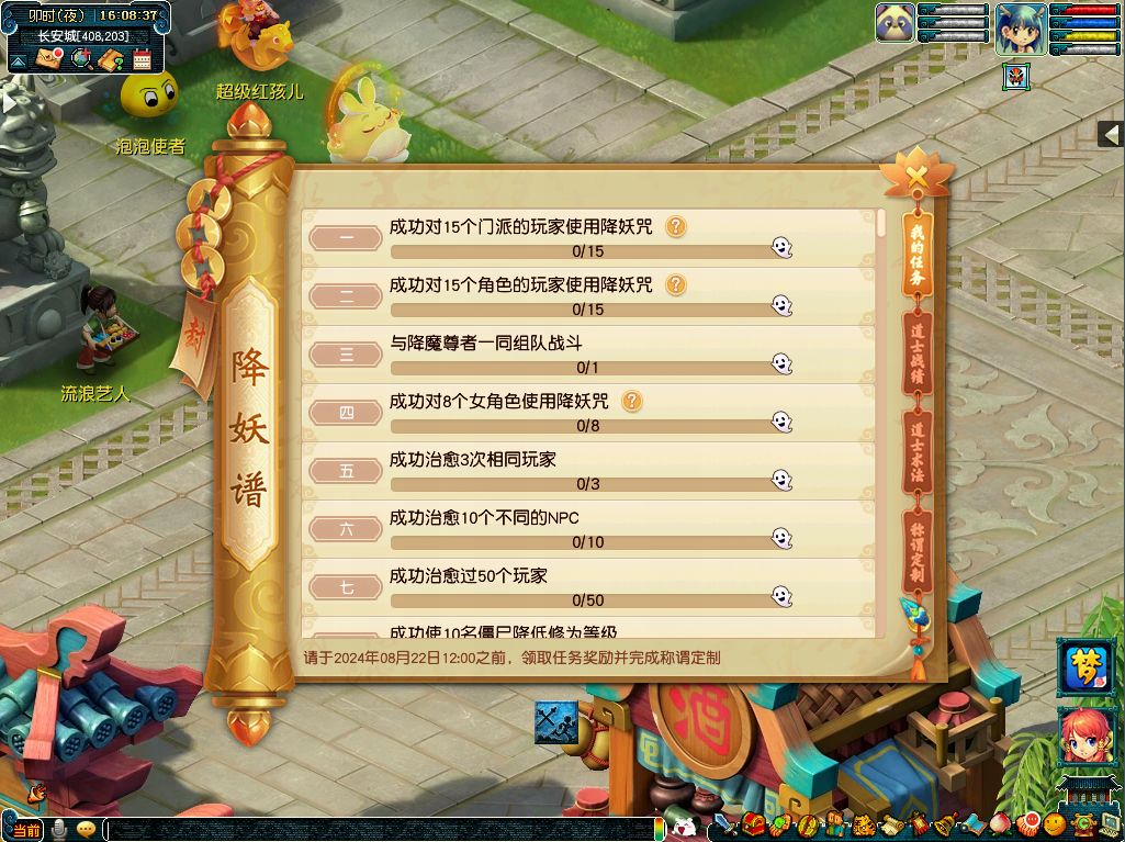 活动期间,建邺城、长寿村、西梁女国、朱紫国、宝象国、傲来国的普通NPC也可能会被“尸毒”/“降妖”,大家可以去这些地方,体验一下“僵尸围城”/“道士下山”的乐趣!