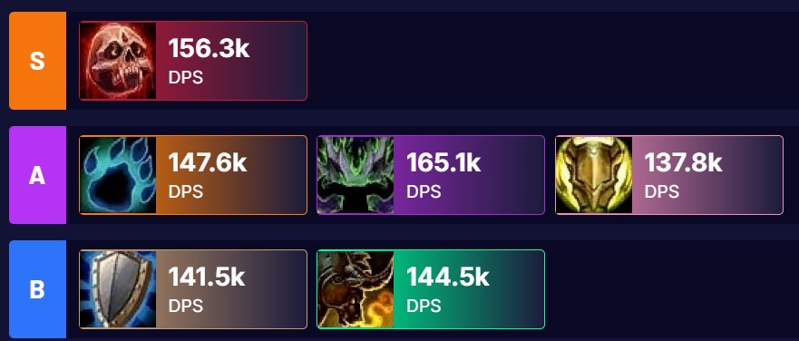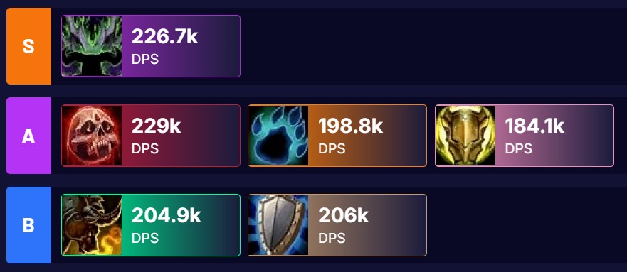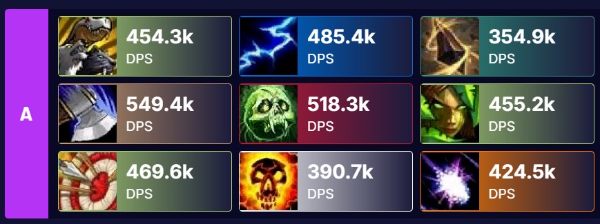A级别的伤害输出职业有武器战、电萨、冰DK、邪DK、浩劫DH、毁灭术、踏风、冰法和暗牧。其中武器战出场率4.9%,电萨出场率6.2%,冰DK出场率6.2%,邪DK和DH出场率4.2%左右、毁灭术出场率4.1%。