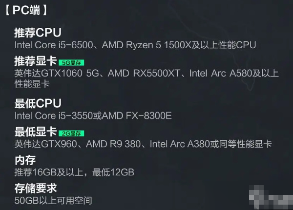 4. 显卡(最低要求): 同理,英伟达GTX960、AMD R9 380、Intel Arc A380级别的显卡,也能让你进游戏,但想要流畅体验,还是洗洗睡吧!