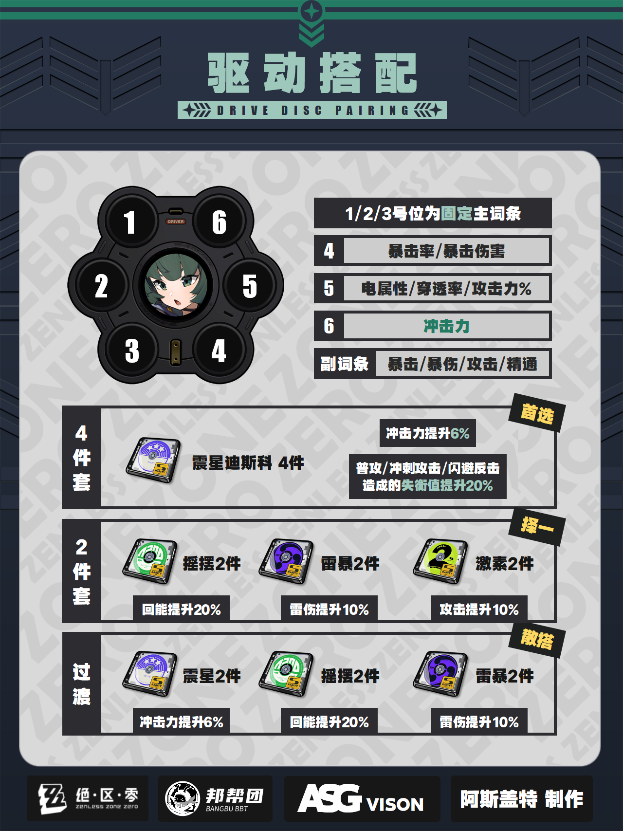 ① 作为击破角色,前期中期(甚至后期)都可以只考虑冲击力——确保6号位的主词条一定是冲击力,再搭配音擎提高冲击力数值。