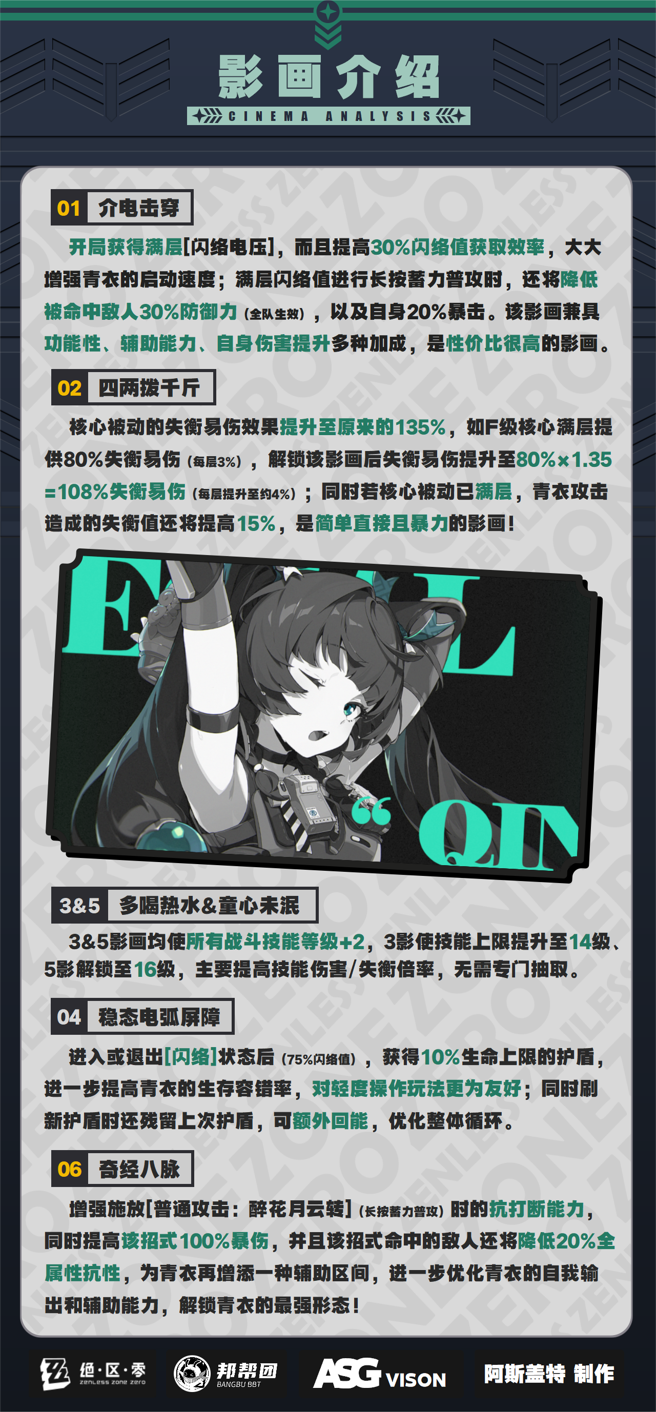 0影画的青衣已经具备了完整的技能机制,额外的能力只需要[强攻]或者[刑侦特勤队]就能触发,大大增强了她的通用性,是目前最好用的击破角色。