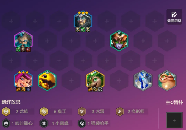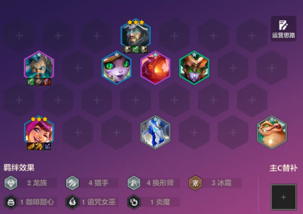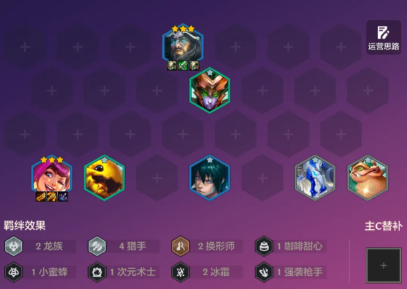 羁绊效果:3龙族+6猎手+3冰霜+2换形战士(T0级别,谁用谁知道!)