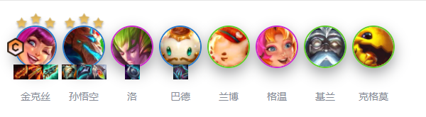 1. 队员名单: 金克丝、孙悟空、洛、巴德、兰博、格温、基兰、克格莫(这阵容,简直是动物园+幼儿园的混合体,趣味性拉满!)