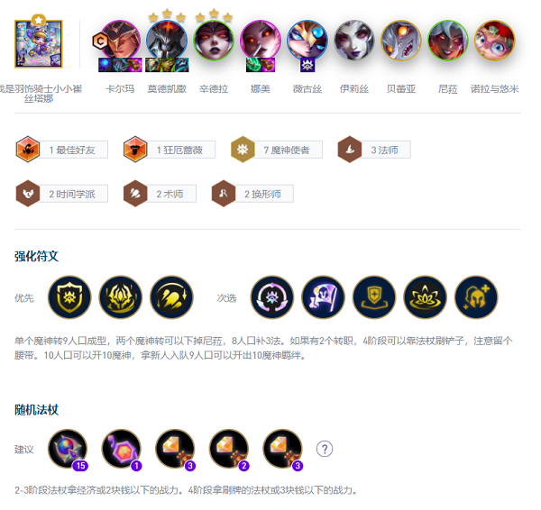 * 友情提示:如果只有一个魔神转职,那就9人口成型。如果有两个转职,可以考虑把尼菈换掉,8人口补3法师。如果运气爆棚,拿到两个转职,4阶段就可以靠法杖刷铲子,但是记得留个腰带哦!10人口直接开10魔神,那个画面,想想都刺激!如果拿到“新人入队”,9人口就可以凑出10魔神羁绊,简直不要太爽!