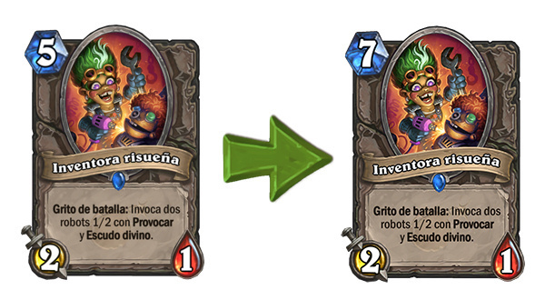 首先我们来看看关于快乐的发明家的削弱,直接从5费的随从变成7费!直接增加两费,真的是出乎我的意外!可以这么说,削弱之后的发明家根本没有了对抗快攻的能力了;而快攻,还会愿意选择一张高达7费的卡牌进入构筑吗?