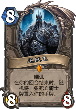 竞技场有句话,叫做只有傻瓜才会拒绝巫妖王,再回到标准,我们看看都有哪些卡组携带了巫妖王,墙德,蓝龙德,偶数术,偶数萨,王子贼,控制法,克隆牧,偶数骑等等,可以说巫妖王是目标版本最出色的中立适用橙之一,身材不俗效果强大,颇有当年砰砰博士的风采。