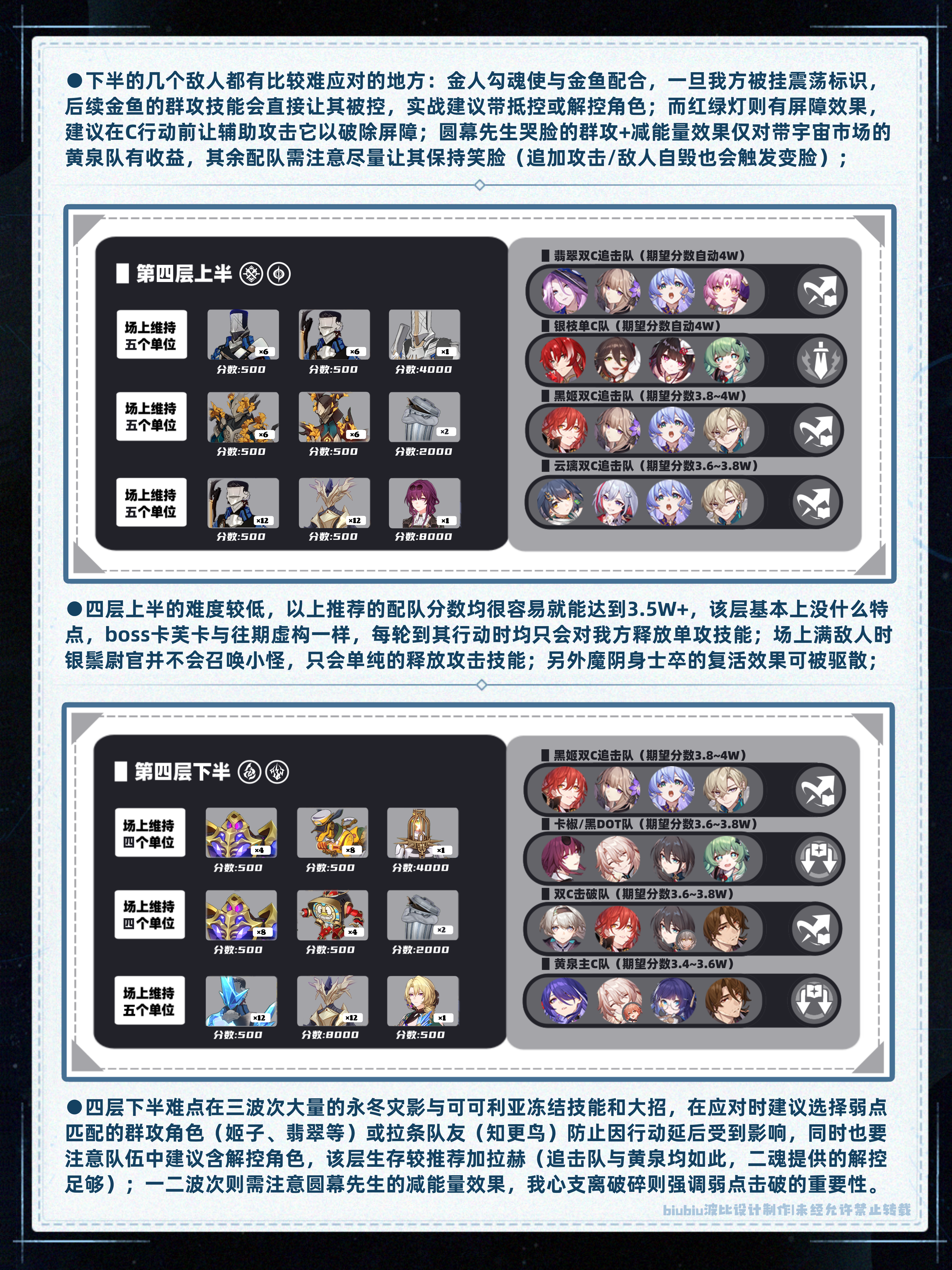 本期最耀眼的明星是谁?没错,就是银枝和翡翠领衔的队伍!他们简直就像开了挂一样,一路高歌猛进。当然,我们也不能忘了老牌劲旅——黑姬追击队,依旧坚挺无比!上下两层都能轻松拿下30000+的高分,简直是追击队的排面!另外,由于Buff的加持,终结技能量消耗低,释放频繁的希露瓦,在本期也摇身一变,成了平民玩家的通关利器!就算你只有一套全四星阵容,也能轻松过关!而且,地图上那多到让人眼花缭乱的物理弱点,也让咱们的云璃妹妹有了大展拳脚的机会!克拉拉也能跟着喝口汤,美滋滋!
