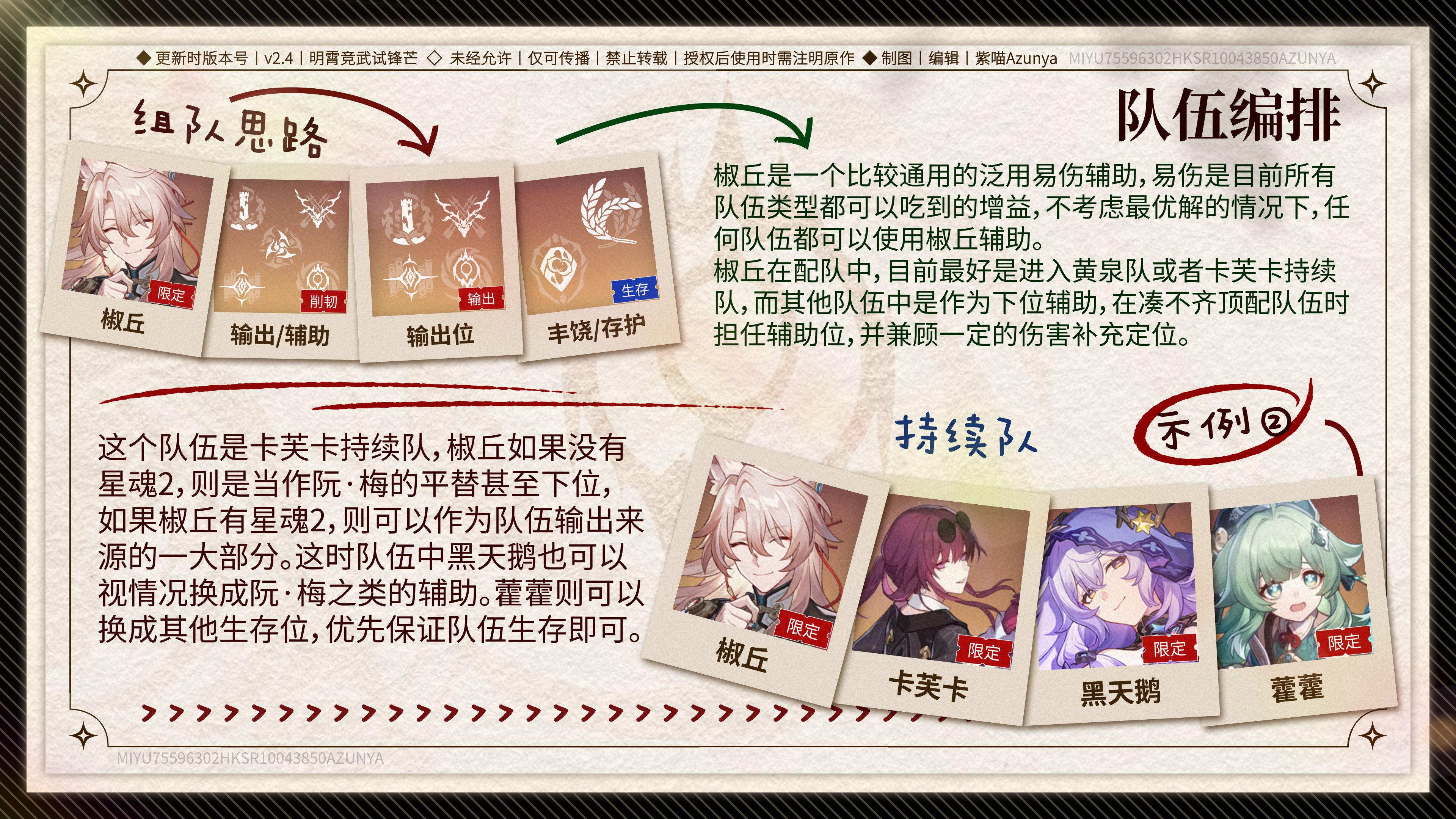 这个队伍的核心就是卡芙卡的持续伤害。如果你的椒丘还没到2星魂,那就把他当成阮·梅的平替版,凑合着用吧!但如果你的椒丘已经2星魂了,恭喜你!他可以直接化身队伍里的主力输出之一!这时候,你可以考虑把黑天鹅换成阮·梅之类的辅助,进一步提升队伍的伤害能力。至于藿藿,还是那句话,活着最重要,换成其他生存位也OK!