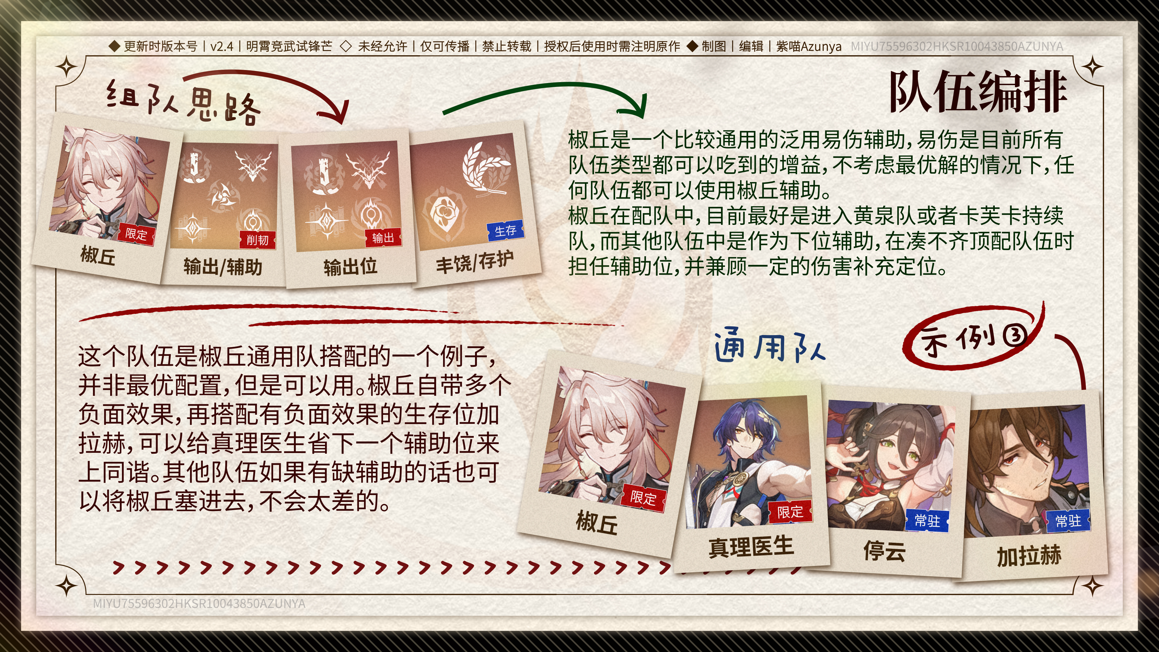 这是一个椒丘通用队的例子,虽然不是最完美的配置,但也能用!椒丘自带多个负面效果,搭配同样能上debuff的加拉赫,可以解放真理医生的辅助位,让他能安心输出。总而言之,如果你队伍里缺辅助,又实在找不到更好的人选,那就把椒丘塞进去吧,至少不会太拉胯!