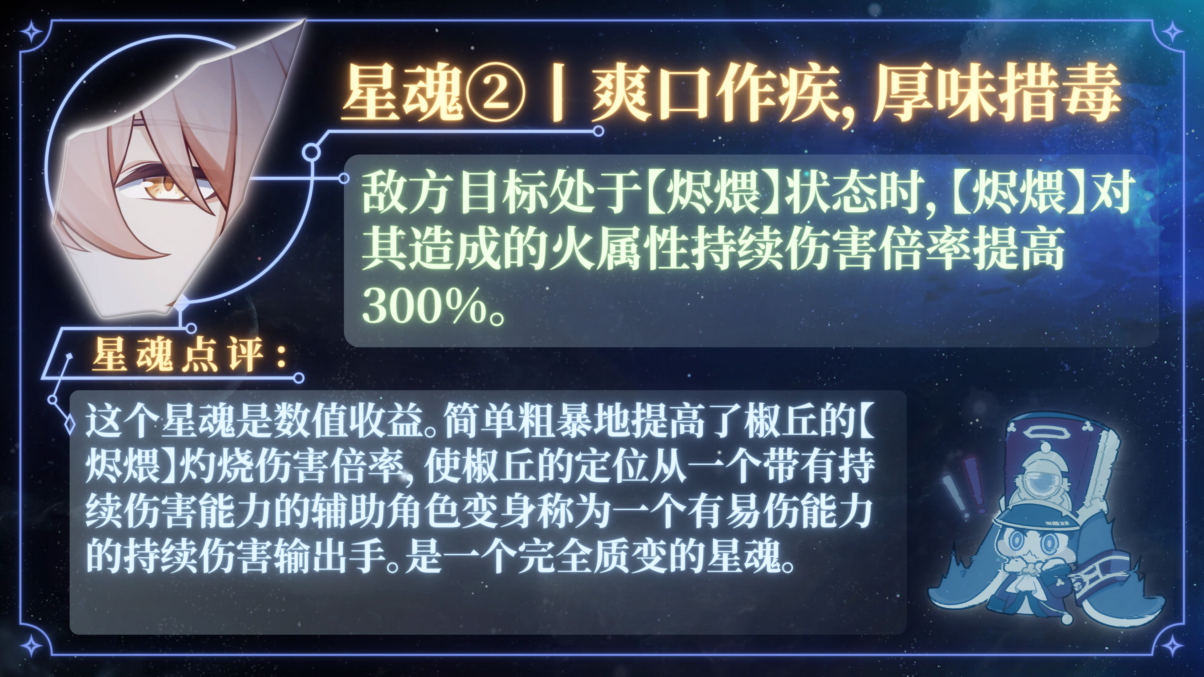 椒丘,这位行走在虚无之道的火属性角色,就像队伍里的“瑞士军刀”,哪里需要往哪搬。他不仅能给敌人挂上易伤,还能靠终结技再来一波易伤buff,负面状态施加频率更是杠杠的。 偶尔还能客串一下持续伤害制造者,满足各种奇奇怪怪的机制判定需求。 总之,队伍里有了他,就像吃了个定心丸,辅助位、副C位随便挑!