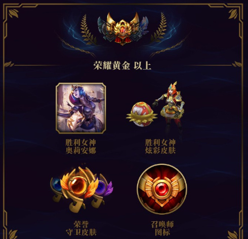 黄金及以上段位的奖励是胜利女神奥莉安娜以及炫彩皮肤。黄金玩家在获得黄金奖励的同时还会获得白银段位的荣誉守卫皮肤和召唤师图标。玩家们需要让自己的单双排和灵活排位段位同时达到黄金以上才能领取两款皮肤。还没在单双排达到黄金的玩家可以在最后的时间冲一下段位。
