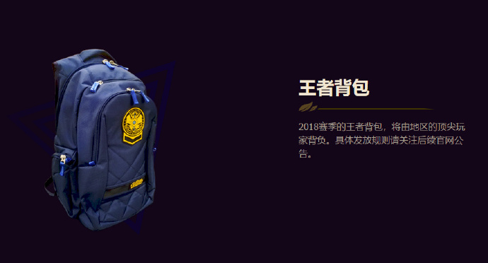 2018赛季的王者背包,将由地区的顶尖玩家背负。具体发放规则请关注后续官网公告。
