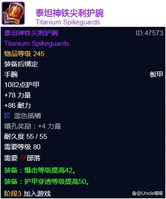 更牛的是,这玩意儿居然能和25人英雄十字军试炼冰吼掉落的碎骨臂铠叫板!简直是平民神器,有木有!当然,两者之间还是有点小区别,主要在于你更偏爱破甲还是精准属性。不过话说回来,土人战士想进场那可是难上加难,所以,先搞到这泰坦神铁尖刺护腕,再搭配上二阶段的神装,没准就能在征战十字军试炼中混个位子,扬眉吐气一把!