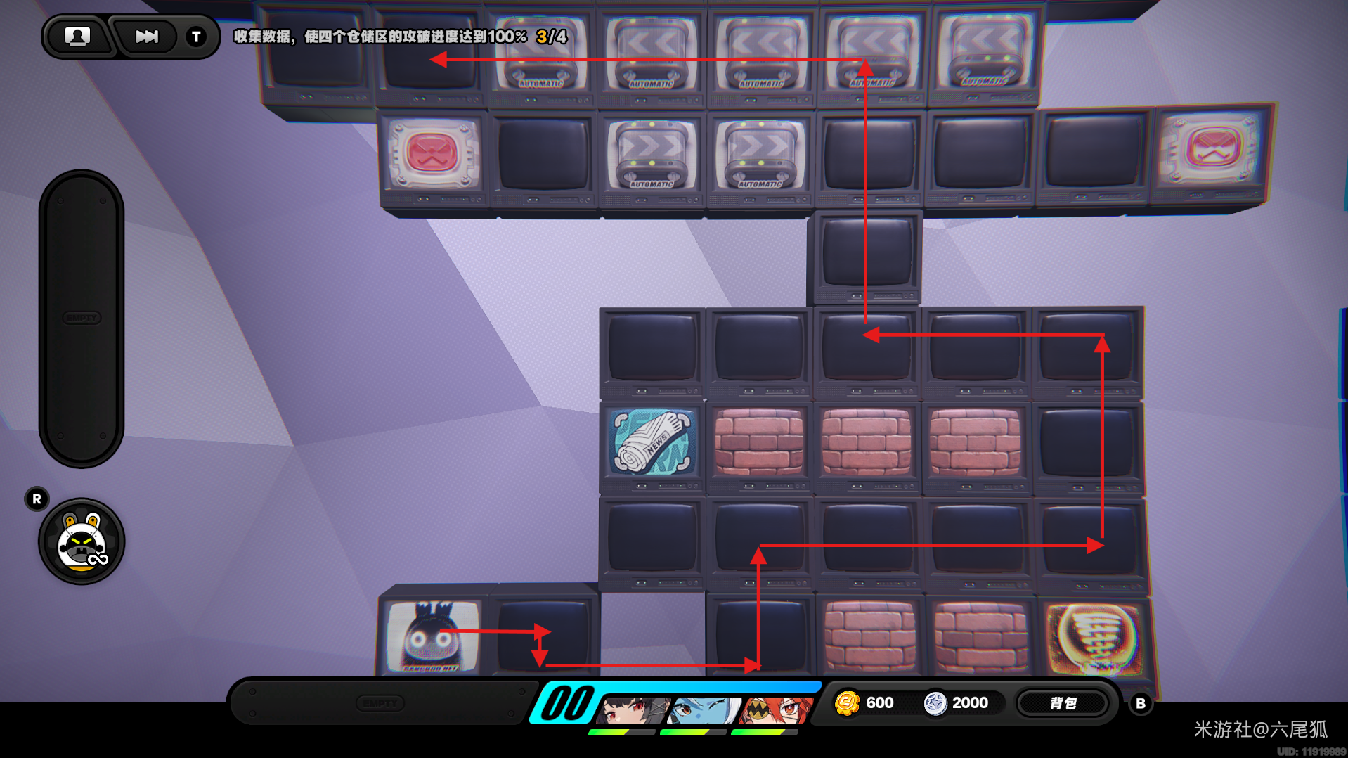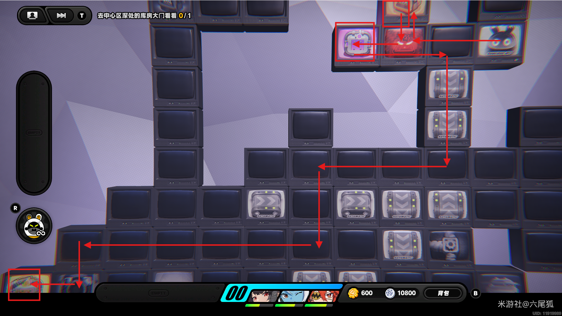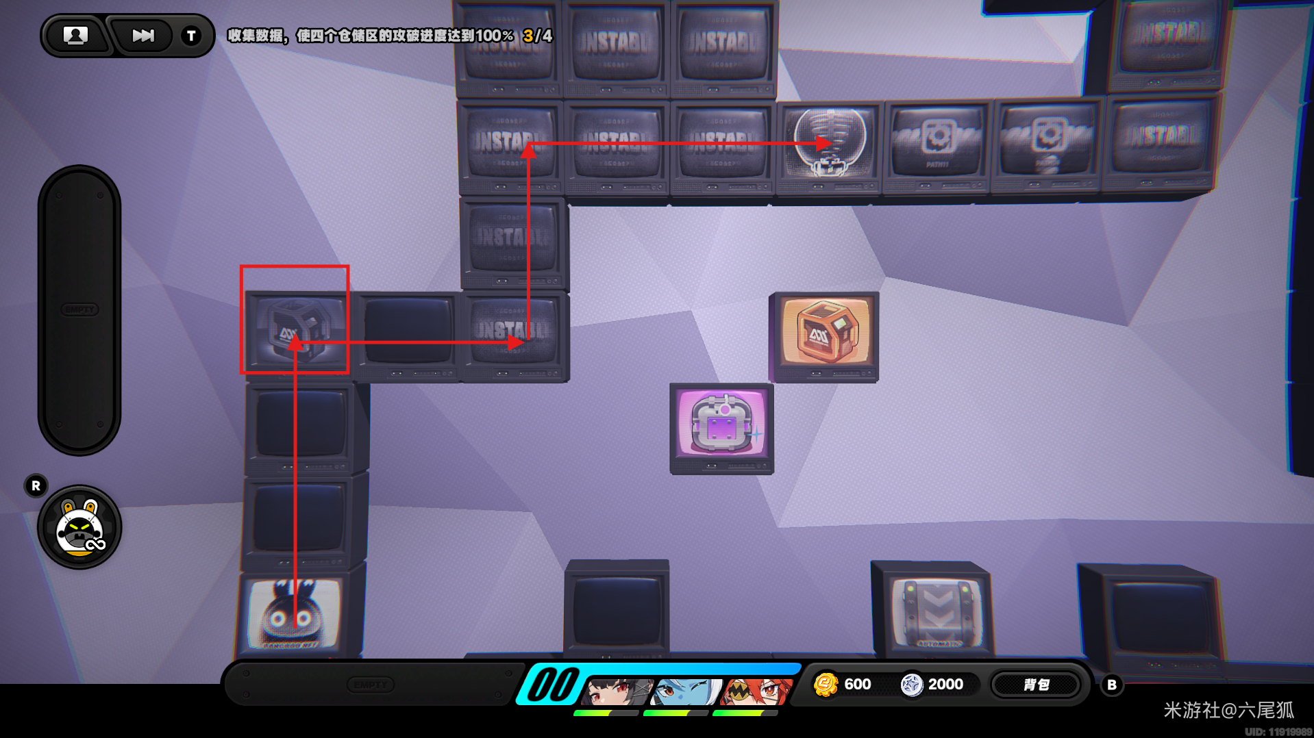 返回上方,在圆圈处使用增幅仪,这次的选择题答案是:2自恋邦布!(仓储区D进度100%,物资箱25/30,钥匙4/4,总物资箱进度106/130)