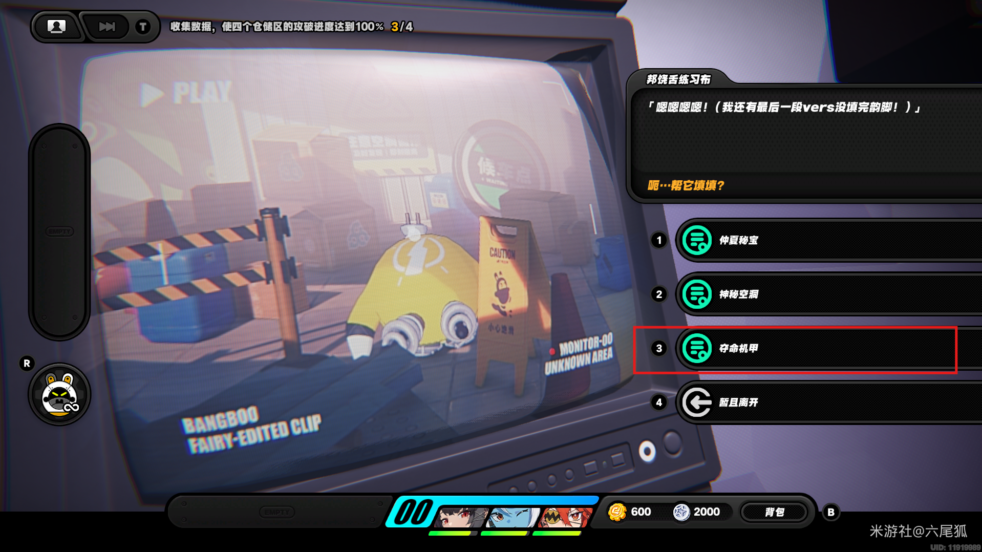 继续往下探索,题目按照押韵规律,应该选择ia韵脚的选项,也就是:3夺命机甲!(仓储区D进度80%,物资箱15/30,钥匙3/4,总物资箱进度96/130)