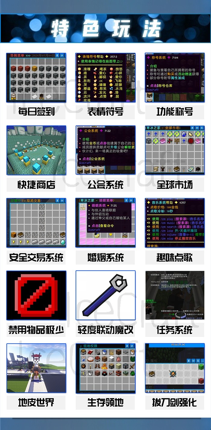 总而言之,Icecraft服务器就像一个充满惊喜的百宝箱,无论你是喜欢探险、建造、PVP还是种田,都能在这里找到属于你的乐趣!还等什么?赶紧加入Icecraft,开启你的冰雪奇缘吧!