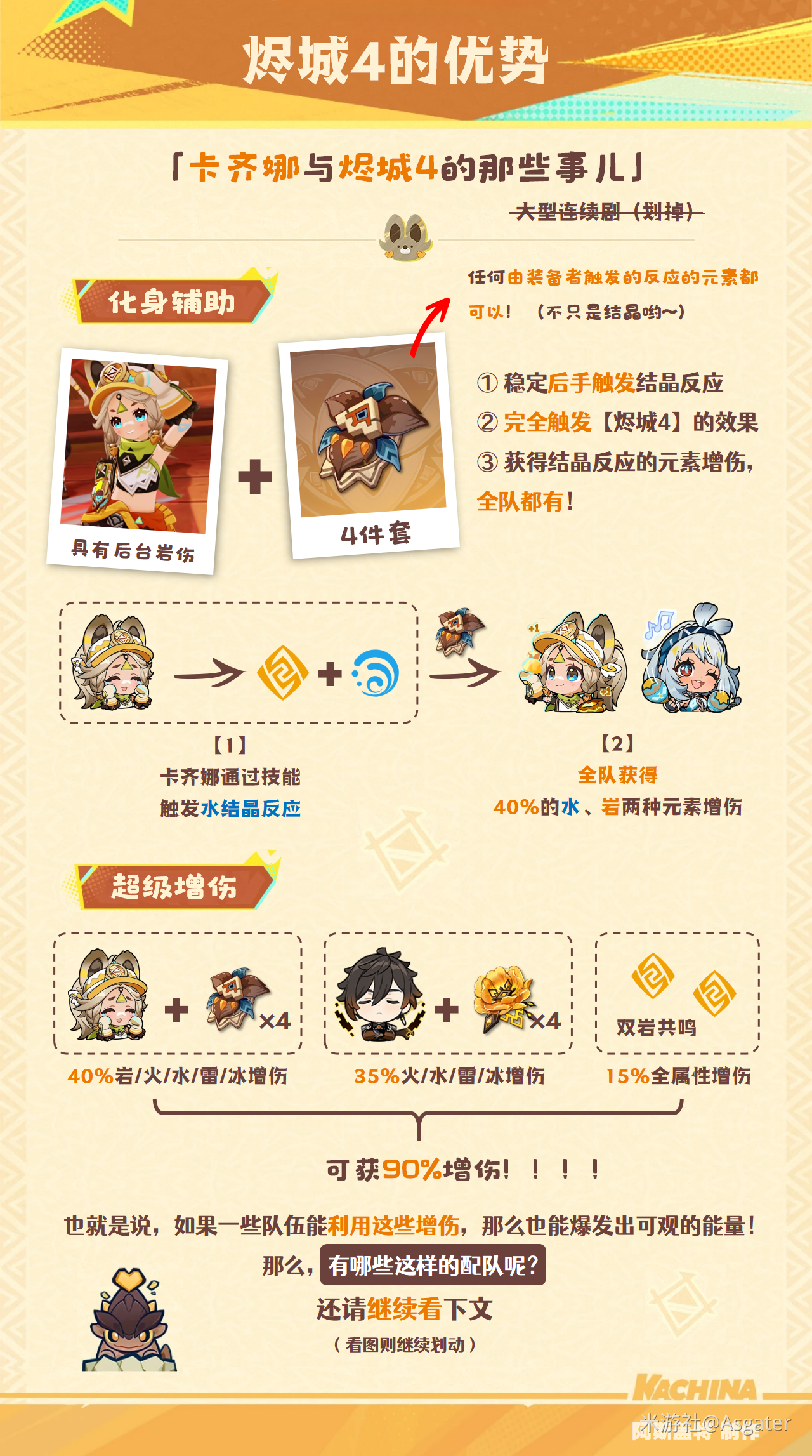 ① 卡齐娜的战技触发火岩结晶反应,通过【烬城4】提高全队的火、岩元素伤害,这个队伍对【烬城4】的利用率简直高到爆炸!