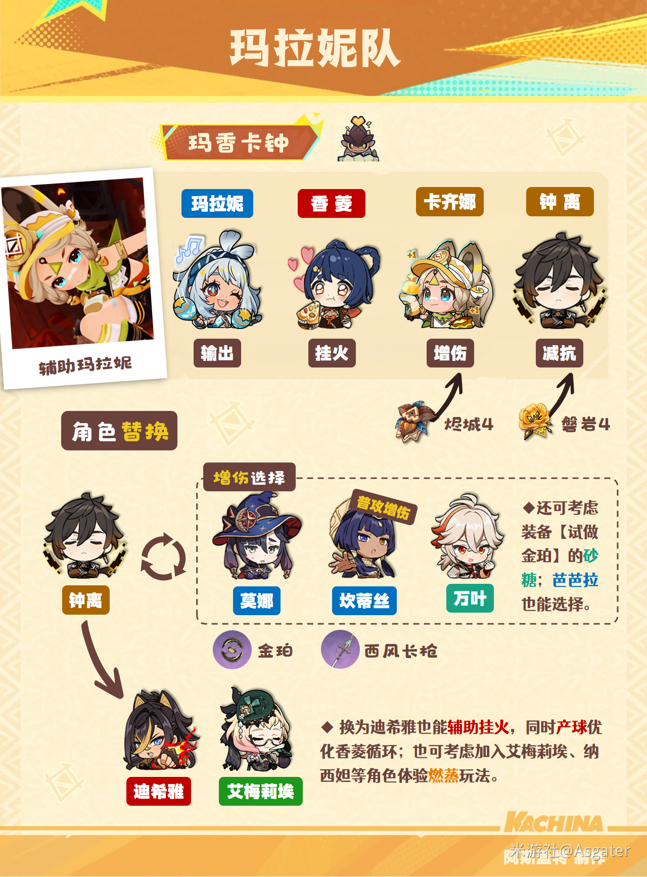 ① 玛香钟卡:玛拉妮A、卡齐娜E(点按)、钟离E(长按)、香菱QE、玛拉妮E接3次巨浪撕咬(Q收尾)