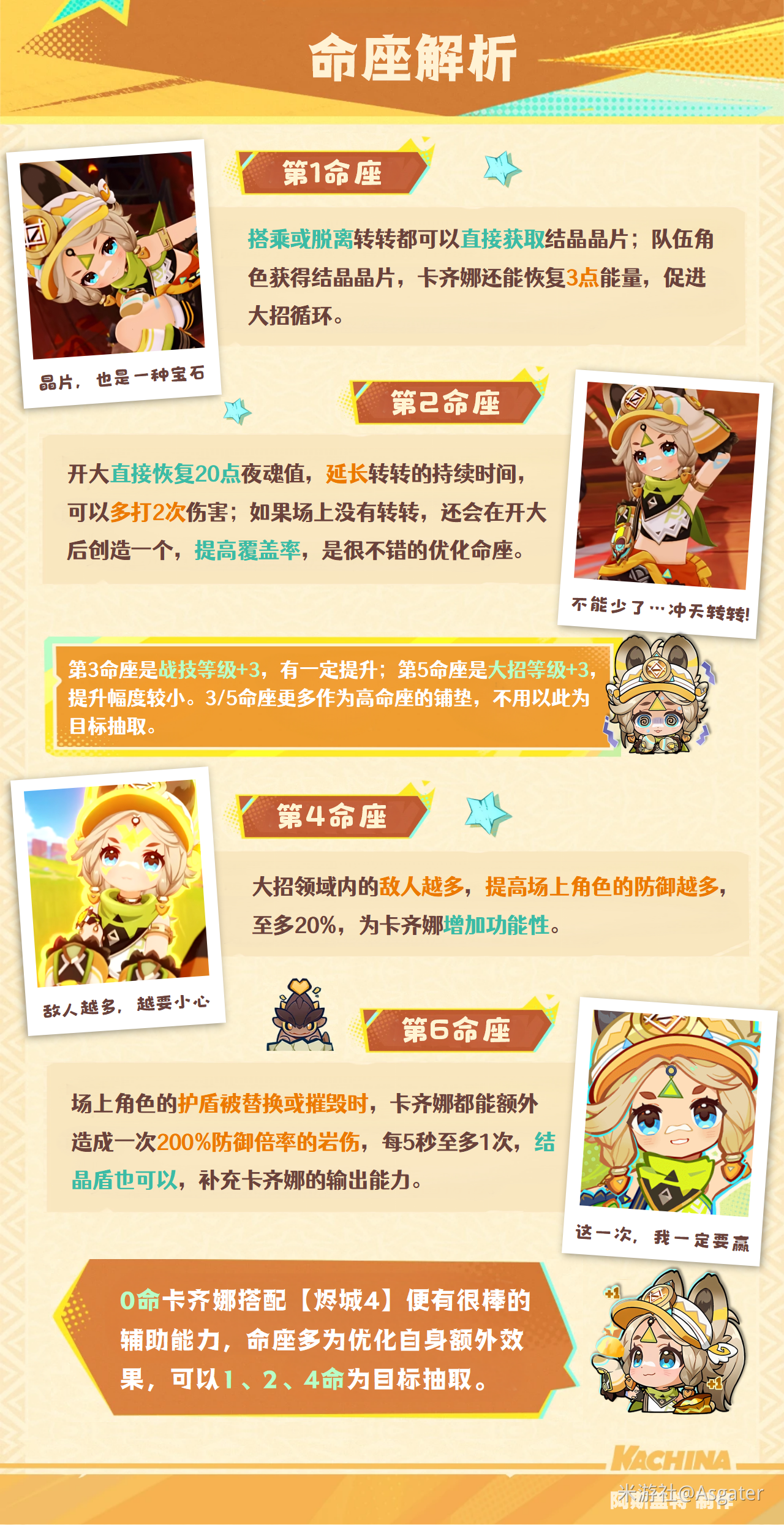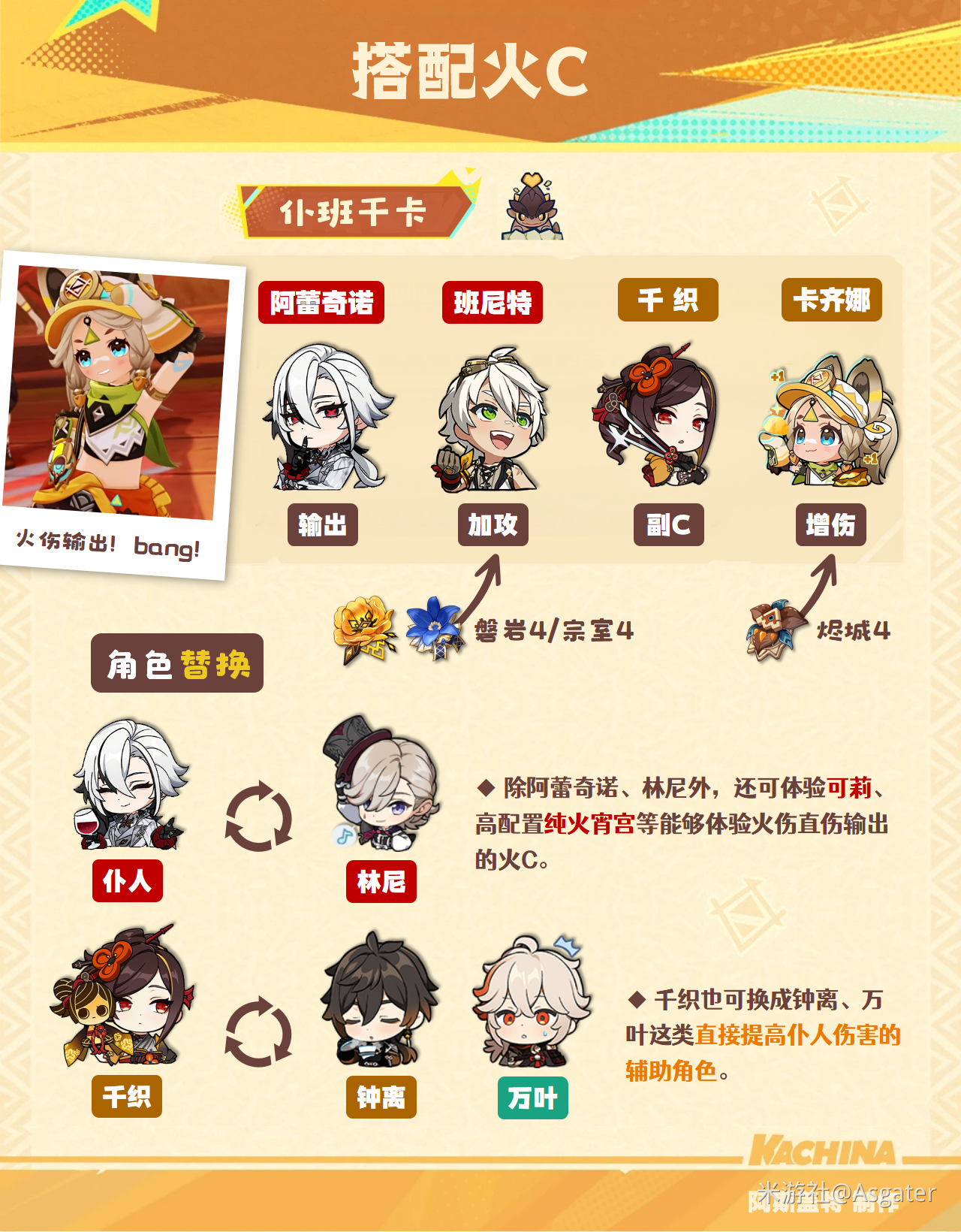 ① 强烈建议凑齐!卡齐娜小姐姐本身没有辅助能力,但她最大的优势就是能轻松触发【烬城4】的效果,给全队提供元素增伤,简直是行走的BUFF机!