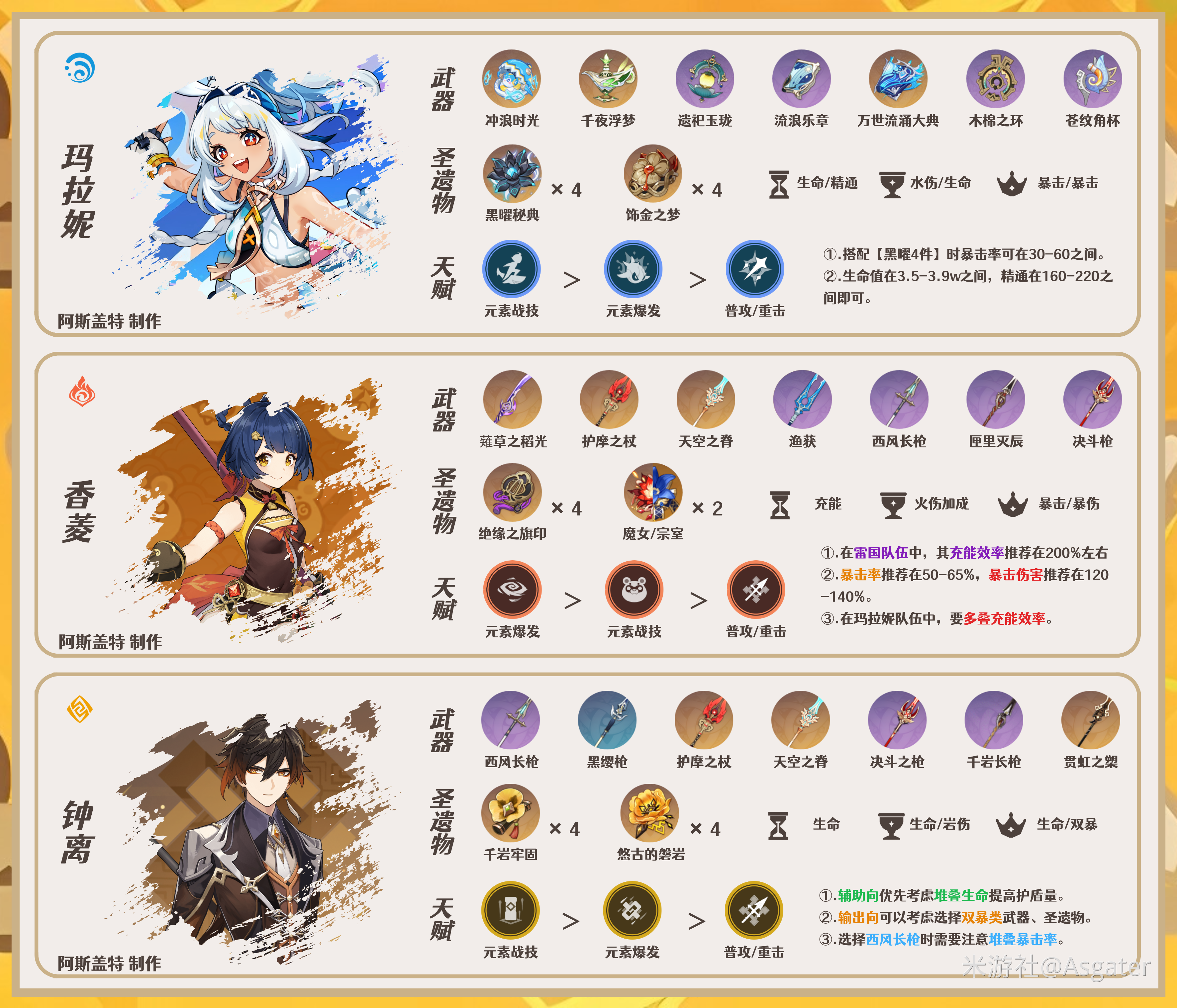 ① 香菱负责持续挂火,记得多叠充能,保证大招循环;钟离推荐【磐岩4】,捡结晶提高玛拉妮的水伤,卡齐娜搭配【烬城4】,持续提高水伤加成,三人合力,输出爆炸!
