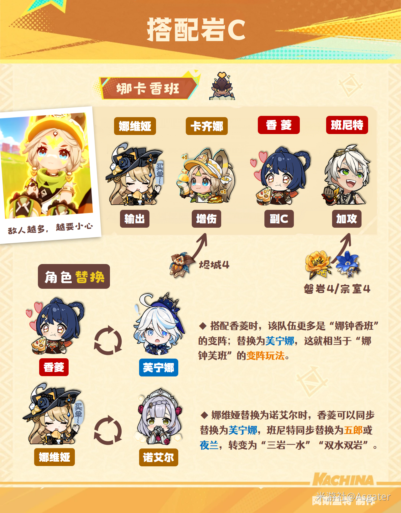 ◆ 卡齐娜搭配【烬城4】也能提高岩元素伤害,所以可以考虑辅助岩伤角色。诚然,钟离的护盾和减抗效果确实更胜一筹,但卡齐娜可以免费获得,还能省下钟离,给另一队更多选择,这也是她入队的优点之一!