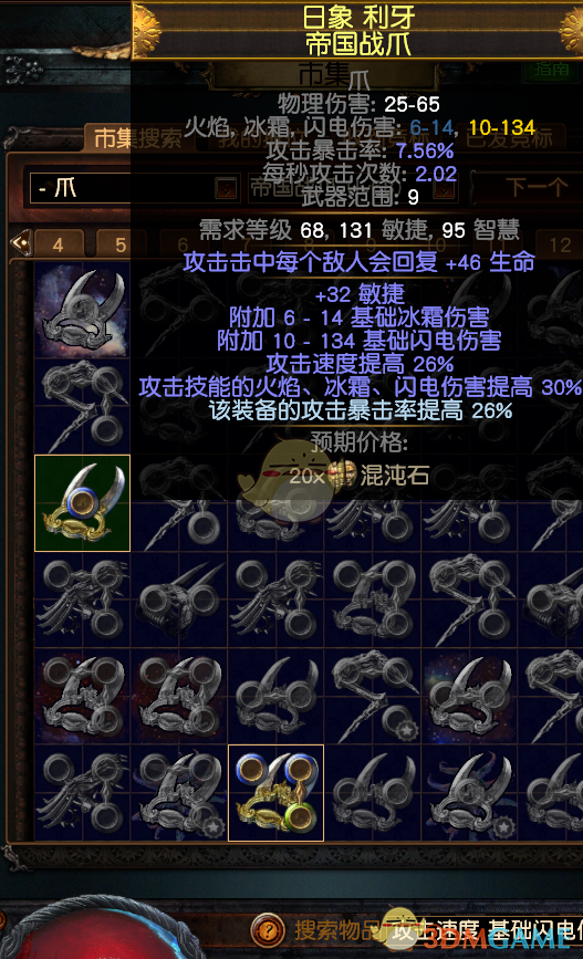 武器,可以选择细剑和爪子,如果细剑那么就把爪子的天赋点,点到剑爆伤那里5点+瓦尔冥约下面4点偷取点,重点词缀:电点伤+攻击速度(最好T1)+随便来点爆伤+随便来点暴击率提高,市场价格大概C到2E不等。