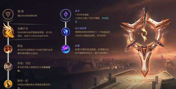主精密系,移动速度对奎因来说十分重要,不论是6级后的游走和前期的对线,奎因的技能只需要配合被动打出伤害即可,况且打一套就走不用恋战,所以说迅捷步法和副系巫术的迅捷是奎因最好的选择。由于奎因属于支援型英雄,参战率会非常高,点出凯旋欢欣以及致命一击能都更好的GANK对手,提高对拼伤害与生存能力。