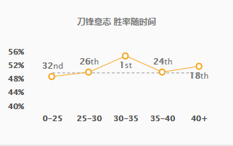 实际上新版刀妹不是一个全时间段都很出色的英雄,但是她在自己的强势阶段就拥有无可匹敌的能力。可以看到刀妹在游戏的30到35分钟,胜率高居第一,也就是说在中期刀妹的威力可以发挥到淋漓尽致。
