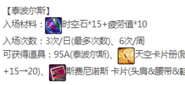 每次通关泰波尔斯地下城可以获得10~12个天空的愿望,单人8~10个网。泰波尔斯地下城入场需要15个时空石和10点疲劳值。