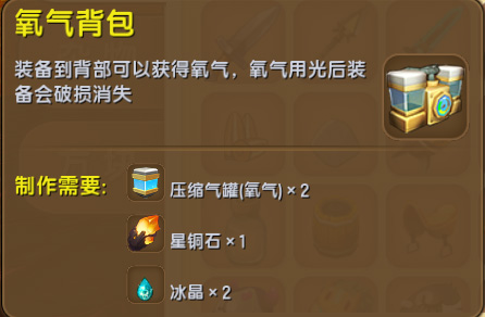 氧气背包通过工具箱制作获得,制作所需材料:压缩气罐(氧气)*2。星铜石*1。冰晶*2。要使用的话只要把氧气背包装备在背部就会自动生效了。氧气背包的作用是在无氧气的环境下,让玩家获得一定的有氧自由活动时间,例如在无氧萌眼星上氧气背包就能派上用场。但要注意氧气用光后装备会破损消失。