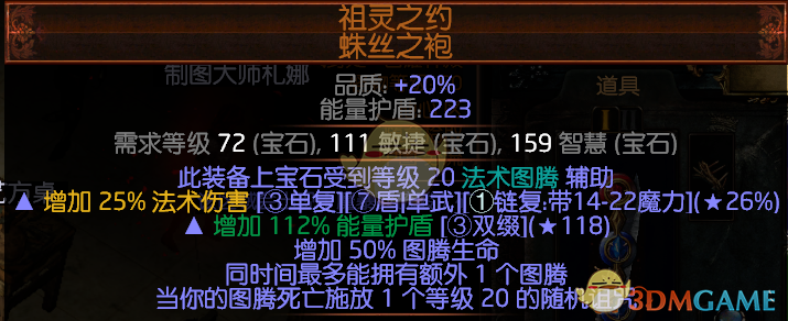 注意事项:能量护盾满的时候是不需要魔力使用技能的(刷怪的时候就不要刻意去堆高魔耗,输出够了,利用护盾满不耗蓝和瓦尔清晰不耗蓝,度过刷怪,进入BOSS,之后无脑把魔力丢空)只有能量护盾未满的情况下,才会需要魔力(正常的50%,升华的支持,不然7L图腾放不了几下就没蓝了)