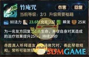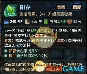 最低的蓝耗,可观的治疗量,最长的CD。反正全员掉血的时候肯定会用,其他时候也没啥机会。不过等拿到秘籍升级后,倒是可以CD好了就用,因为可以回蓝。