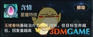 第二行选择含情,本来觉得这种瞬抬救急的技能减少治疗量20%不好,所以之前选择的都是春归,但是春归也很鸡肋,因为你根本不会满血用这个技能去刷盾的,所以后来改成含情试试,结果发现有奇效,在T血量掉到20%-30%时,瞬抬有奇效,可以回1/4-1/3的血量。