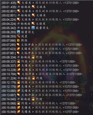 裸燃烧的难点在于,你需要在 灼烧+火冲+炎爆+炎爆 这个小循环中,把火冲2和火冲3压到无限接近于灼烧读条完毕打出,让火冲4有更大的可能接上(图中可以看出,火冲3-火冲4的间隔是2.997秒,非常极限)。这样非常容易失误,容易导致灼烧的括号先返还,火冲的括号被吞。但是如果打的太早,就会导致火冲4接不上,见下图: