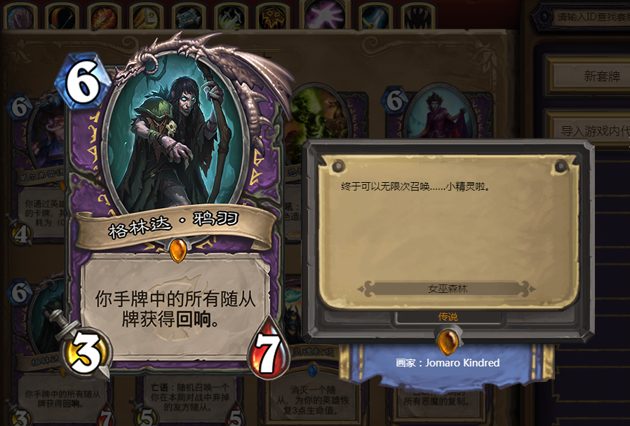 我们的思路很简单,就是利用鸦羽的效果,让我们的随从都拥有回响效果,然后连续使用五只机械跃迁者,这样我们就能给机械随从减少五点费用,我们就可以在这两只随从效果下无限使用奇利亚斯,利用奇利亚斯的磁力效果,无限增强我们的场面,而我们的场面到底能有多强,就看我们的手速有多块了。虽然我们的关键牌只有三张,但由于我们是宇宙卡组,所以想要凑齐关键牌,就算我们是术士,也不是能够轻松凑齐的,但我们的生存能力也是非常强大的,可以保证我们能在对手手下坚持到最后,而只要我们打出来这个combo,对手几乎很少能打败我们。
