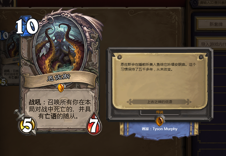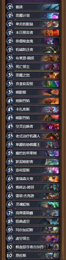 我们牌组里带了不少的嘲讽亡语随从,在抵挡对手的进攻方面有着很好的作用,而恩佐斯则可以更好的利用这个效果,让我们已经使用过的嘲讽亡语随从再次回到我们场上,让它们再次为我们防守对手的进攻,而恩佐斯拉回来的虚空领主,还可以被我们之后的鲜血掠夺者古尔丹再次拉回来,进一步的抵挡对手的进攻,而如果对手后期乏力的话,我们甚至可以凭借恩佐斯拉回来的亡语随从打败对手。