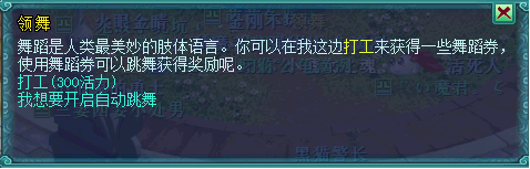 跳舞介绍:和“领舞”对话,玩家可以使用“舞蹈券”来跳舞,跳舞的同时会获得大量经验;