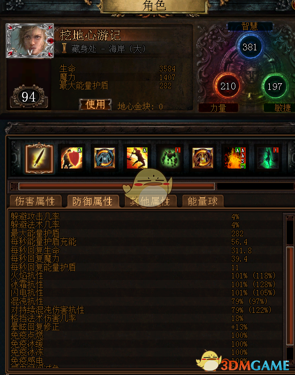 下面开始数据讲解:这套装备加上天赋,药剂效果是1.69倍,20%*1.69=33%恨意的物理转伤33%+三项19%+头10%+衣服30%+盾牌8%=100%物理转元素伤 元素抗性:盾牌4%+药水16%+自身75%+净化光环6%有天赋的加成=101% 因为相当极限,不按照我的配装基本上差一点点都无法实现无敌。