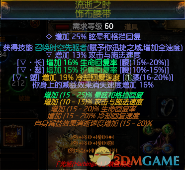 腰带:选择一:星空底洗出冷却-20%、药剂方面词缀和抗性、血量和魔力,呵,这不是镜子吗?那么请选择二:饰布腰带-流逝之时
