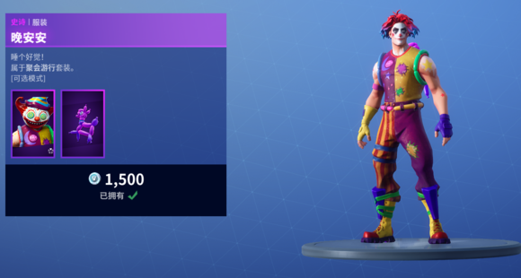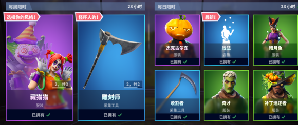 堡垒之夜10月31日商城,每周限时类皮肤刷新了男女的小丑套,“晚安安”,“藏猫猫”,还有鬼火南瓜套“空心头”。锹刷新了“收割者”,“雕刻师”,“吱吱镐”。每日限时的皮肤刷新了“暗月兔”,“杰克古尔冬”,“奇才”,“补丁巡逻者”。最后还刷了一个“戏法”表情。