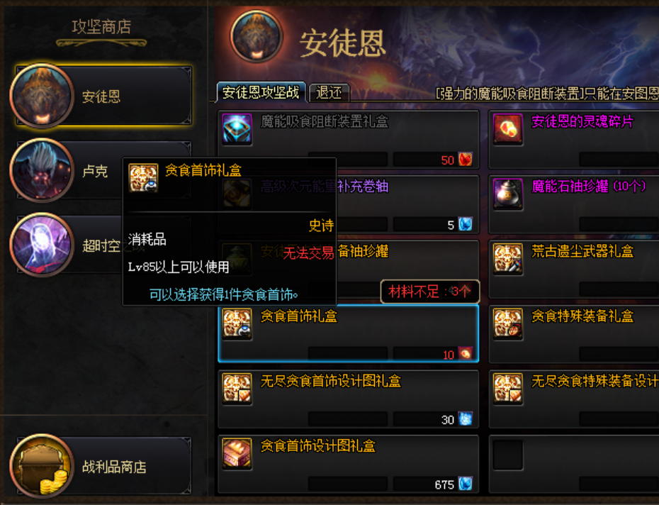 第三个就是贪食首饰礼盒了,贪食首饰在90版本前中期一度沦为过气装备,但是却在90版本末期又重返光辉。最主要的原因就是可以升级成为超时空首饰,以前没有恍惚套的小伙伴们,去做一套大无尽也可以升级超时空,或者不舍得用恍惚升级超时空的小伙伴,也可以做大无尽去升级,这样就可以减少很多麻烦。
