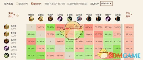 这是最近七天传说-5胜率最高的套牌数据,月末的天梯和月初的比较相似,有一定的参考性,其中偶数骑胜率排名第一,紧接着的是奇数骑,偶数萨,治疗园,奇数贼,可以看到的是快攻几乎包揽了前五名,偶数骑算是一个另类的中速卡组吧。