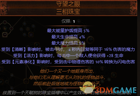 三相珠宝:选择活力击中回血(30)和清晰被击中4秒回魔20%。前者可以保证自残永动循环中高hit法术自动回血,折算下来是1、2千的秒回。后者在自残永动循环中每秒回魔接近500,完美续航,甚至可以支持MOM。赛季初期这种珠宝比较难找,后期比较好找了,价格也不算贵。