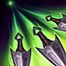 阿卡丽呈锥形掷出五枚苦无,伤害她面前的敌人并减速处于最大距离处的敌人。如果在能量几近全满时施放,阿卡丽还会获得相当于一部分伤害值的治疗效果。在5级时,此技能会对小兵和野怪造成额外伤害。