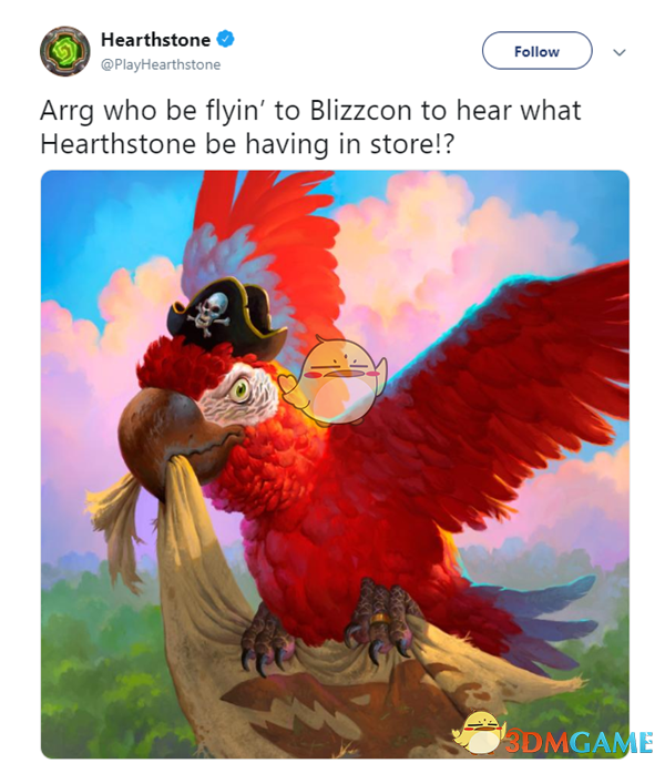 官方在发布的海盗鹦鹉图片上配上了“谁会飞到暴雪去听商店里有什么炉石传说”,这更意味着这只飞翔的鹦鹉很有可能会出现在暴雪嘉年华上,并且会成为新拓展包的宣传大使。