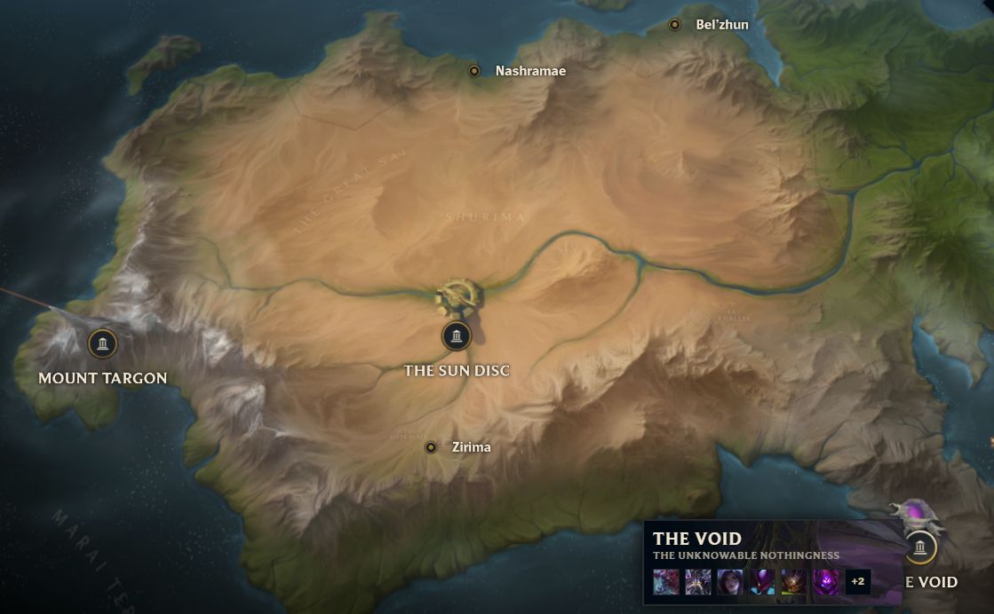 再比如恕瑞玛帝国,从图中我们可以看出虚空入侵的遗址在东南角,而恕瑞玛帝国的太阳圆盘所在位置则在整个沙漠的偏中心,太阳圆盘的西边就是著名的巨神峰。