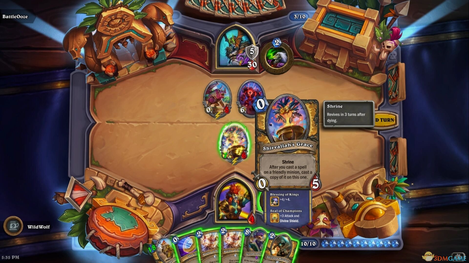 最后也是信息量最大的这个动物之灵,引出一个新关键字Shrine,具有该异能的随从死亡后会在三回合(休眠)后复活。视频中它和左上角的0攻随从都在被消灭后进入了休眠计数状态。不知道Shrine这个异能会不会是这个系列可收藏卡牌的一部分呢?如果不是,那这次的单人内容面子确实大,简直是“独占了一个版本的关键字”。