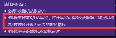 4%的概率掉落K/DA福袋,打开福袋可以获得3个皮肤碎片,以及足以将三个皮肤碎片升级永久的橙色精粹。