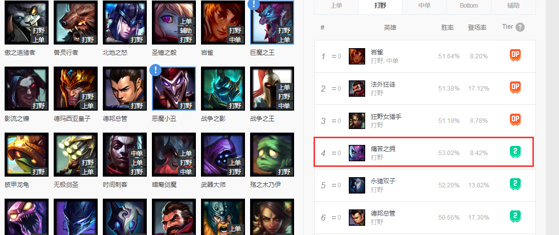 首先来看看OPGG上的寡妇数据,在当前版本中,寡妇的胜率是全部打野英雄中的第二,仅次于登场率只有百分之二的小丑。胜率方面是非常有优势的,也能看出在这个版本里,寡妇是真的强势。